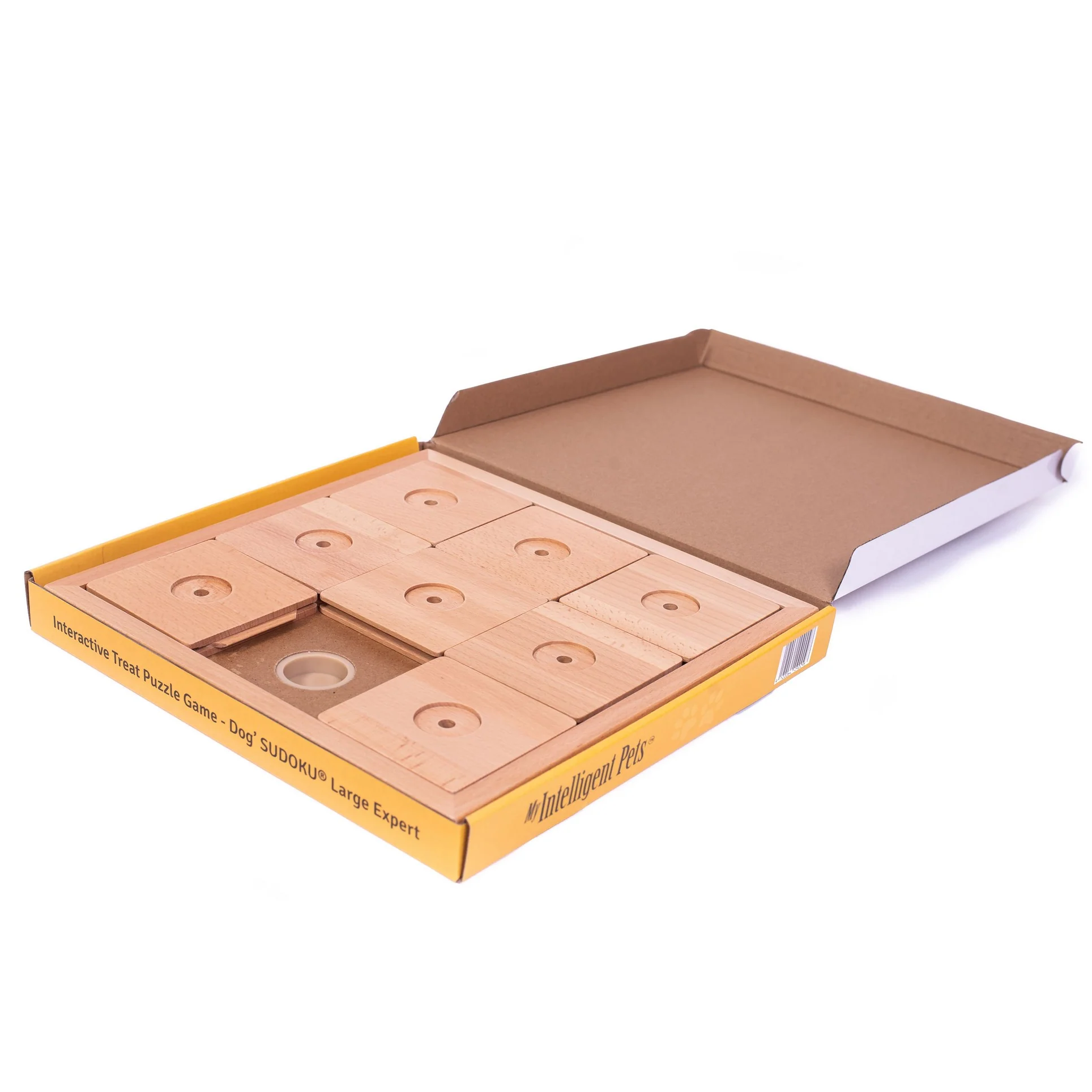 - Todos los juegos y rompecabezas de Mis Mascotas Inteligentes están hechos de madera certificada recubierta con un barniz al agua inocuo para humanos y animales. Use solo golosinas secas para jugar con nuestros juguetes interactivos.