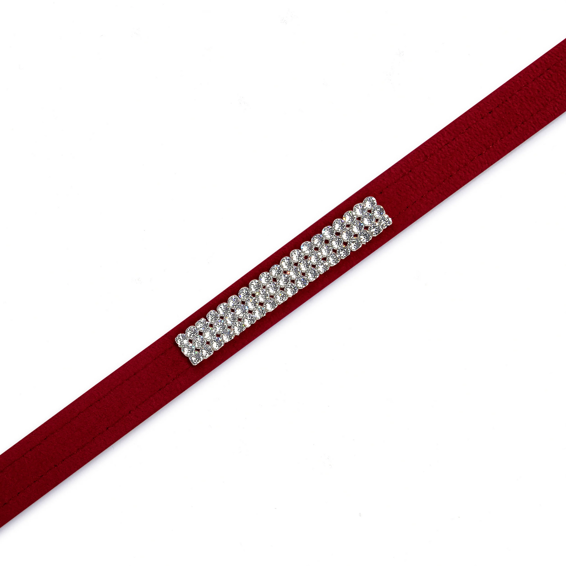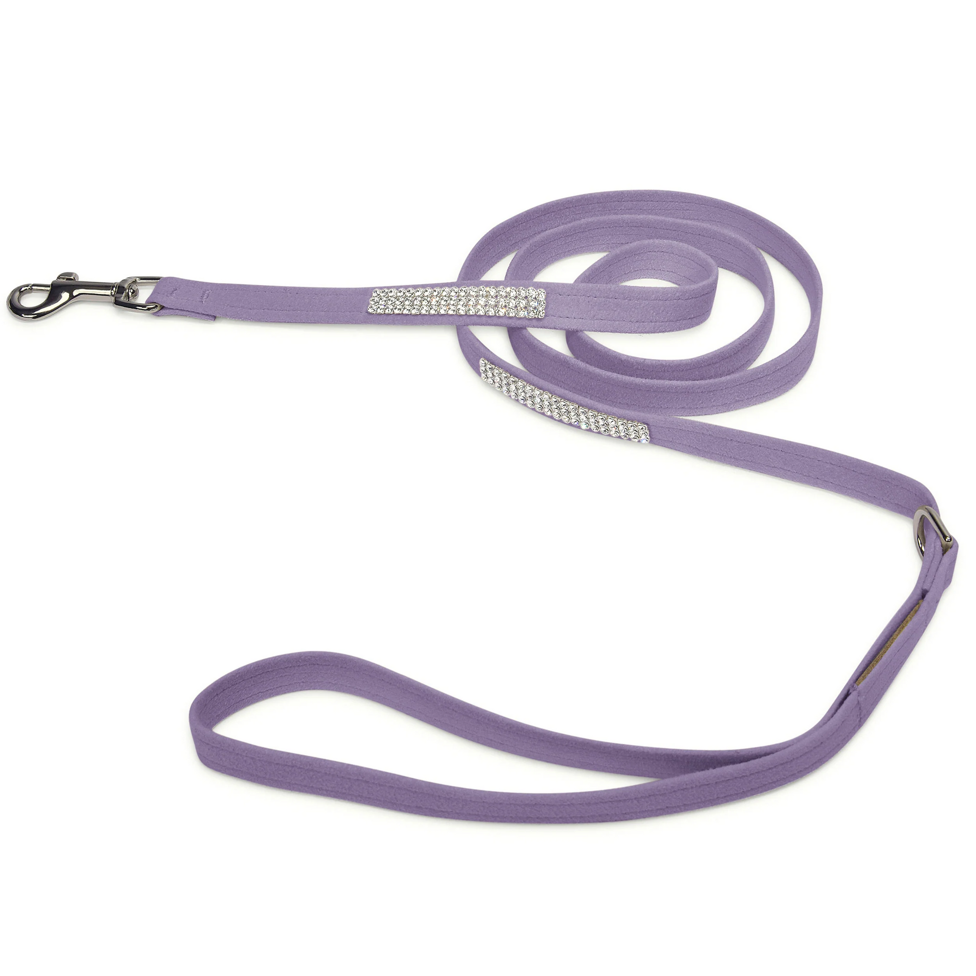 This cherished dog leash is embellished with 3 rows of dazzling, Premium Giltmore Crystals. The stunning rows of the world's finest European Swarovski® crystals are sure to turn heads! Made from Ultrasuede® fabric with the soft texture and feel of premium suede. Ultrasuede® also has the highest grade of durability, making this leash resistant to stains and discoloration. Machine washable and lovingly made in the USA, this lightweight, easy-to-maintain luxe dog leash with smart features ensures a truly lasting value.