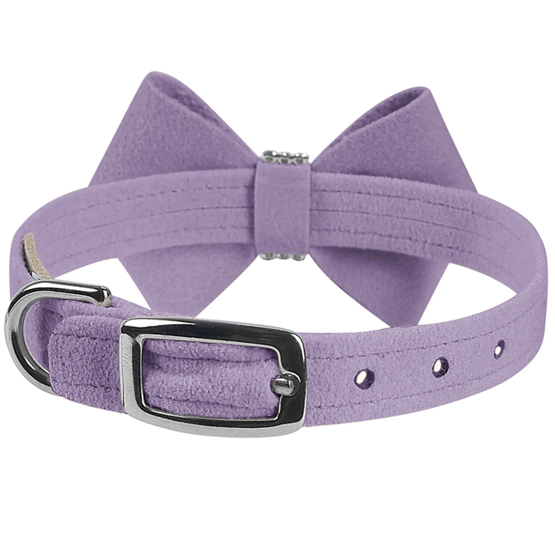 This Nouveau Bow Collar has a premium look and feel, while being easy to maintain. Made from Ultrasuede® fabric with the soft texture of premium suede, ensuring safety for your pup's neck. Ultrasuede® offers the highest grade of durability, making this collar resistant to stains, plus machine washable! The luxe Nouveau Bow attracts attention with bold curves embraced by the world's finest European Swarovski® crystals. Ideal for ID tags, charms and decor, they are not designed for pulling dogs. Artisan-crafted with care in the USA🇺🇸